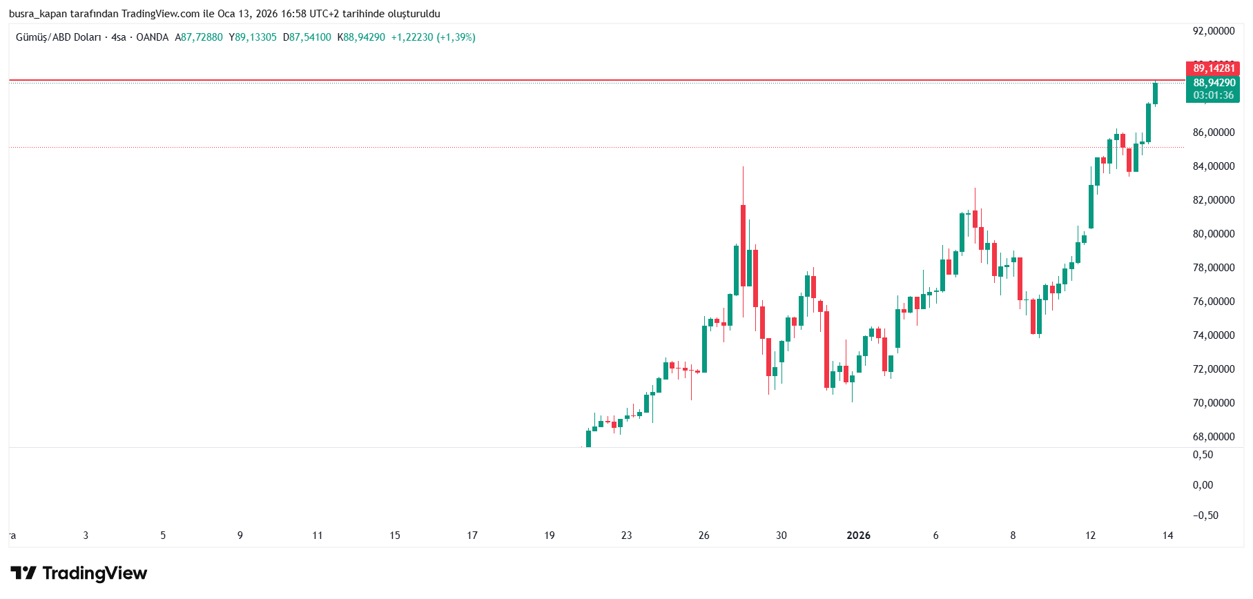 Ons gümüş veri açıklanmadan önce 86,77 dolar seviyesindeyken, veri sonrasında 88,19 dolara çıktı.