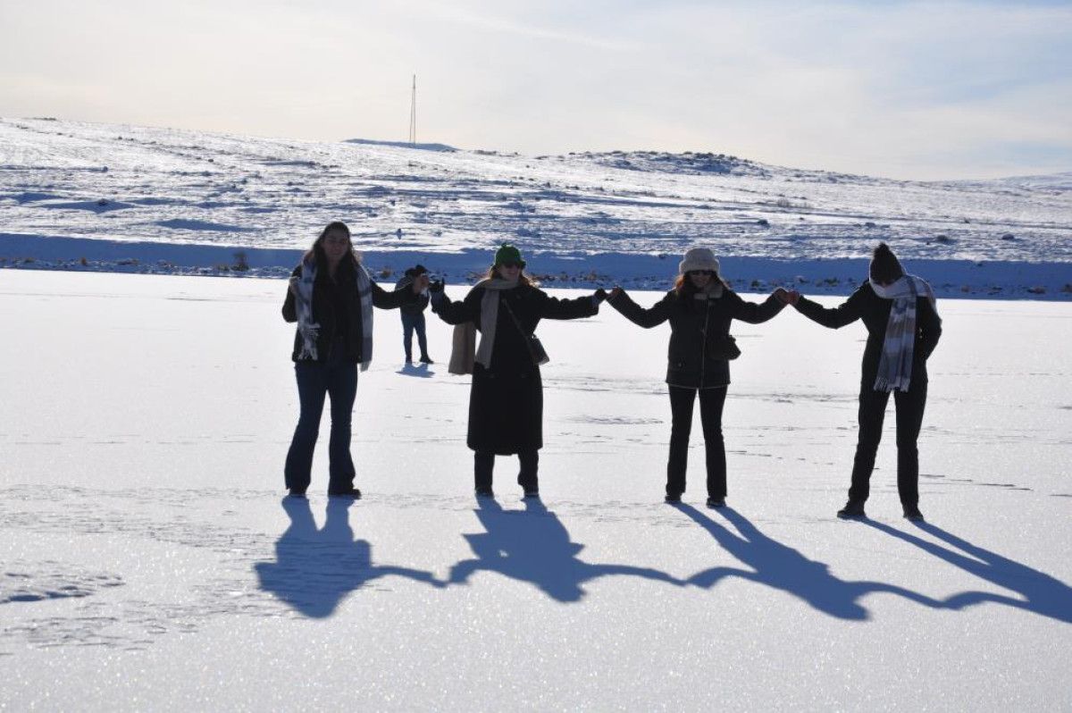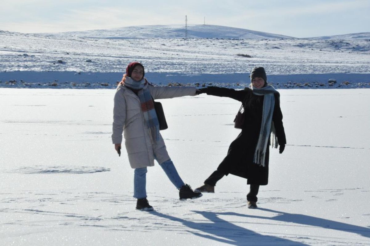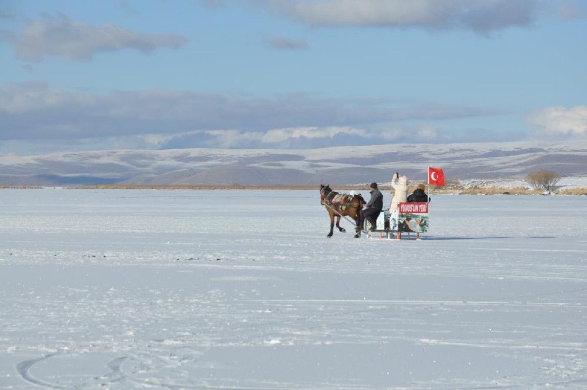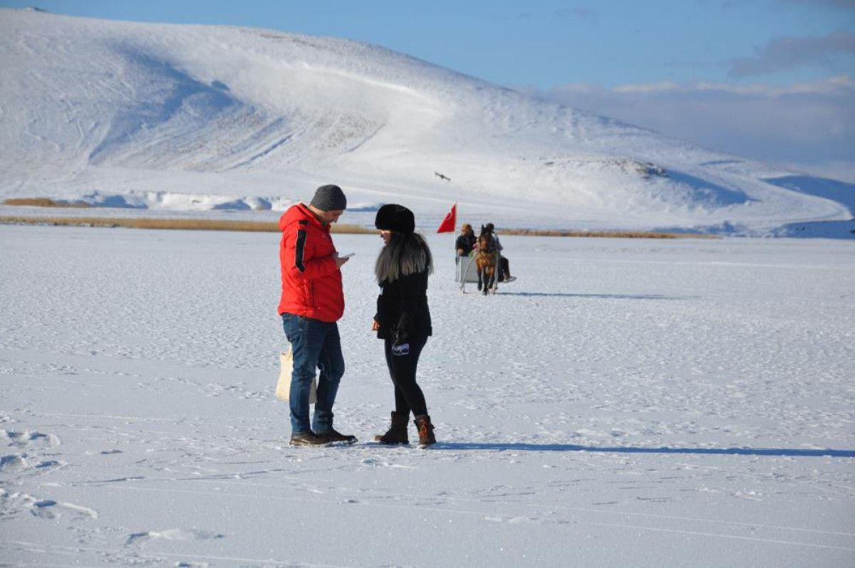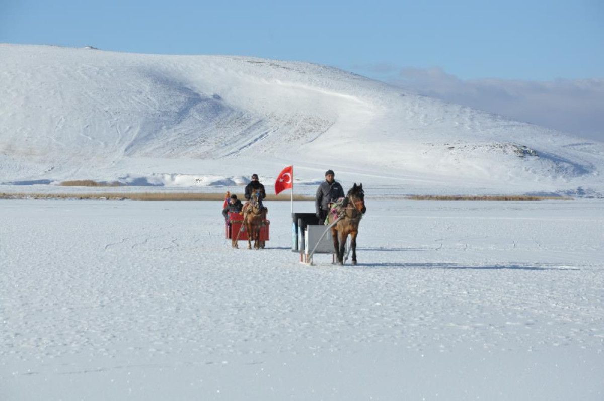 Aslan, “Çıldır gölü buz tuttu. 15-20 santim aralığında buz kalınlığımız var. Atlarımızı çıkardık, atlı kızaklarla gezinti yapıyoruz. Kar motorlarımız, atlı kızaklarımız hepsi gölün üzerinde gelen misafirlerimizi Mart ayına kadar ağırlamaya çalışacağız” diye konuştu.