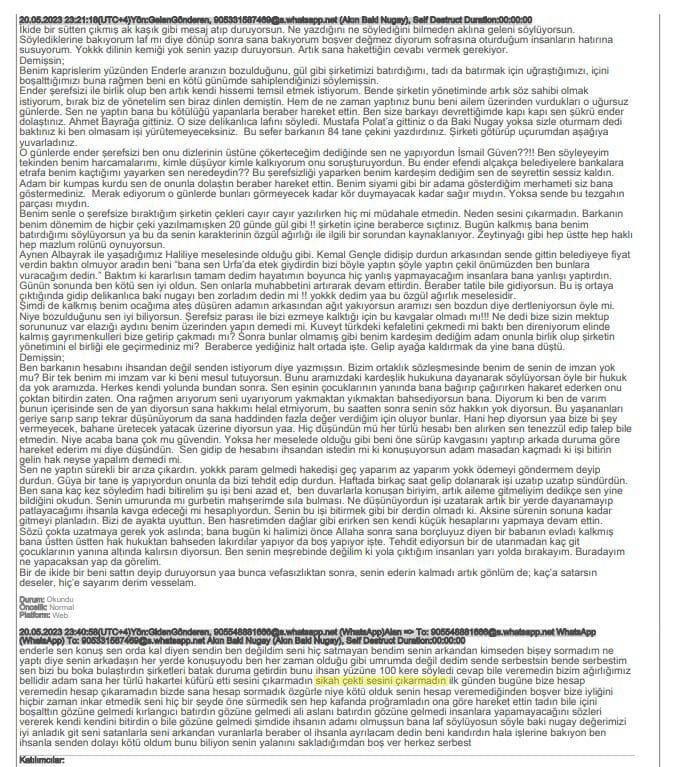 Aziz İhsan Aktaş’ın ‘gayri resmi ortağı’ olarak nitelendiren İsmail Güven ile Aktaş’ın gizli ortağı Akın Baki Nugay’ın mesajlarında Güven’in, “İhsan yüzüne yüz kere söyledi cevap bile veremedin, bizim ağırlığımız bellidir, adam sana her türlü hakareti küfürü etti sesini çıkarmadın, silah çekti sesini çıkarmadın ilk günden bugüne bize hesap veremedin…” mesajı dikkat çekti.