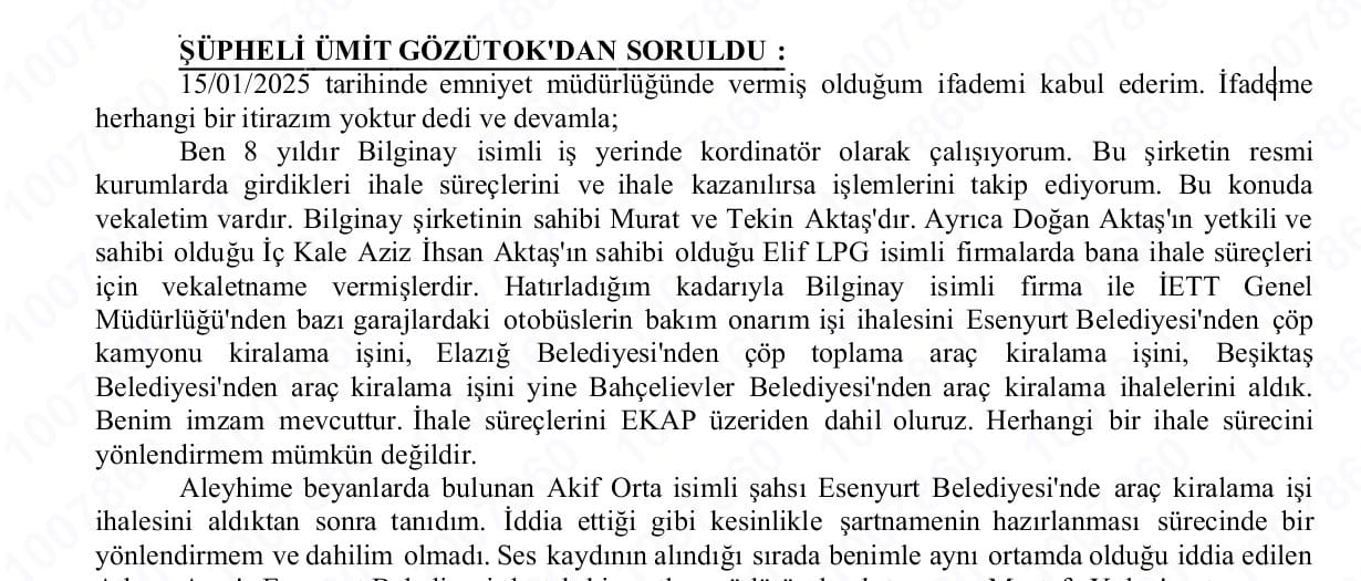 Ümit Gözütok’un ifadesinde Bahçelievler Belediyesi’nden araç kiralama ihalesi aldığını beyan ediyor