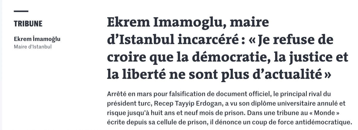 İstanbul Büyükşehir Belediyesi’ne düzenlenen yolsuzluk operasyonunda tutuklanan Ekrem İmamoğlu, ülkesini şikayet etmek için Batı medyasını kullanmaya devam ediyor. Fransızlara seslenen İmamoğlu, Le Monde için bir makale kaleme alarak daha önceki şikayetlerine devam etti.