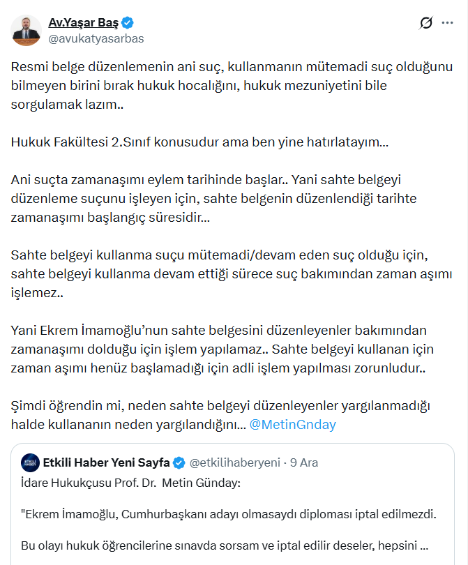 İmamoğlu’nun “sahte belge” düzenlediğini iddia den AKP İstanbul 6. Dönem İl Yönetim Kurulu Üyesi Yaşar Baş, “Resmi belge düzenlemenin ani suç, kullanmanın mütemadi suç olduğunu bilmeyen birini bırak hukuk hocalığını, hukuk mezuniyetini bile sorgulamak lazım. Hukuk Fakültesi 2. Sınıf konusudur ama ben yine hatırlatayım. Ani suçta zamanaşımı eylem tarihinde başlar.. Yani sahte belgeyi düzenleme suçunu işleyen için, sahte belgenin düzenlendiği tarihte zamanaşımı başlangıç süresidir. Sahte belgeyi kullanma suçu mütemadi/devam eden suç olduğu için, sahte belgeyi kullanma devam ettiği sürece suç bakımından zaman aşımı işlemez. Yani Ekrem İmamoğlu’nun sahte belgesini düzenleyenler bakımından zamanaşımı dolduğu için işlem yapılamaz.. Sahte belgeyi kullanan için zaman aşımı henüz başlamadığı için adli işlem yapılması zorunludur.. Şimdi öğrendin mi, neden sahte belgeyi düzenleyenler yargılanmadığı halde kullananın neden yargılandığını” şeklinde bir paylaşım yaptı.