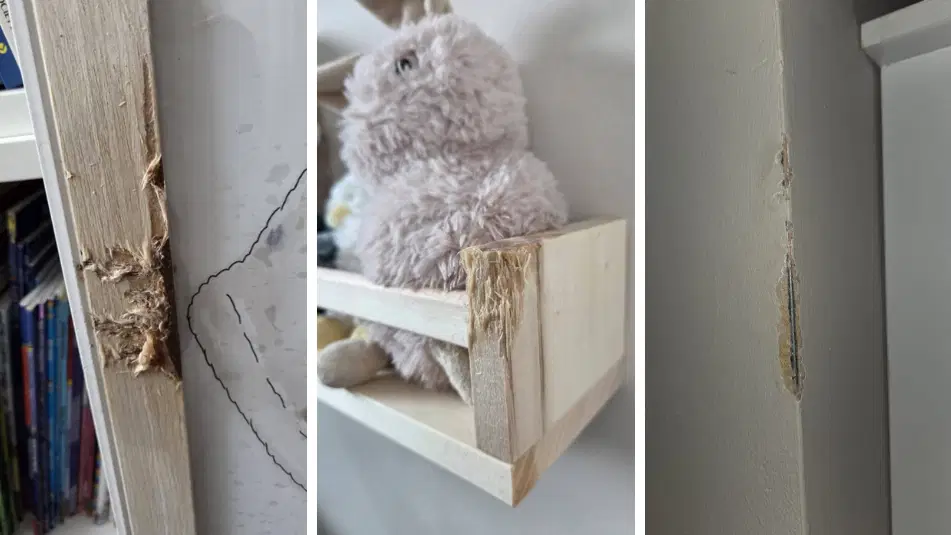 Jess’in evi, Junior’un kemirmeye çalıştığı için zarar görmüş raflar ve duvarlarla dolu