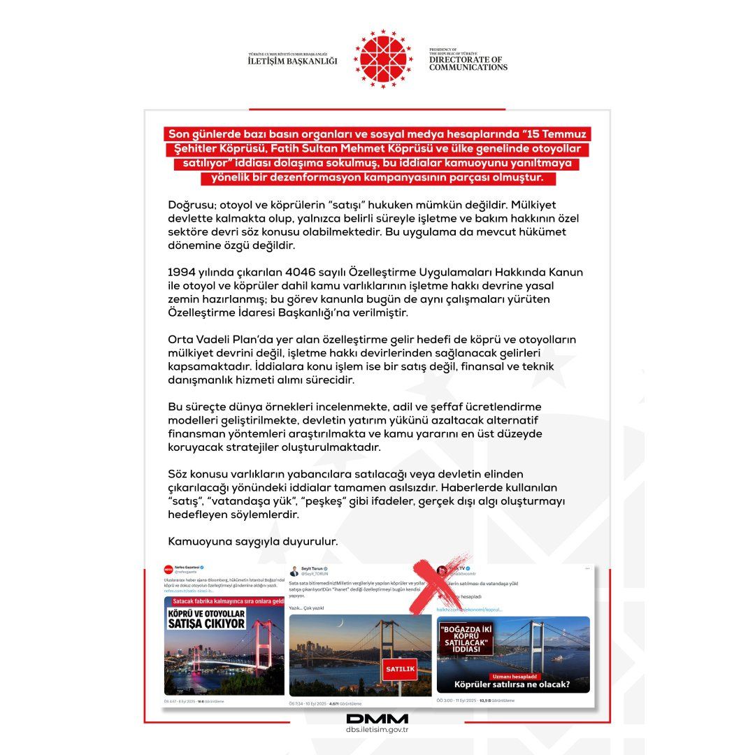 Yapılan resmi açıklamada, bu iddiaların kamuoyunda yanlış algı oluşturmayı amaçlayan bir dezenformasyon kampanyasının parçası olduğu iddia edildi. Açıklamada, köprü ve otoyolların mülkiyetinin devlette kalmaya devam ettiği, yalnızca belirli sürelerle işletme ve bakım haklarının özel sektöre devredilebildiği ifade edildi.